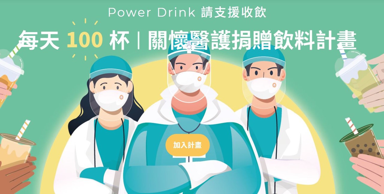 醫護人員上班穿著全套防護衣,上廁所或是吃飯都很不方便,加上每天從早忙到晚,常選擇快速、方便的飲料來解渴,因此有一群人發起「Power Drink 請支援收飲」透過集資方式,每天捐贈100杯飲料,輪流分送給為疫情而辛苦的單位,目前已累計797人贊助,累積金額超過50萬元。