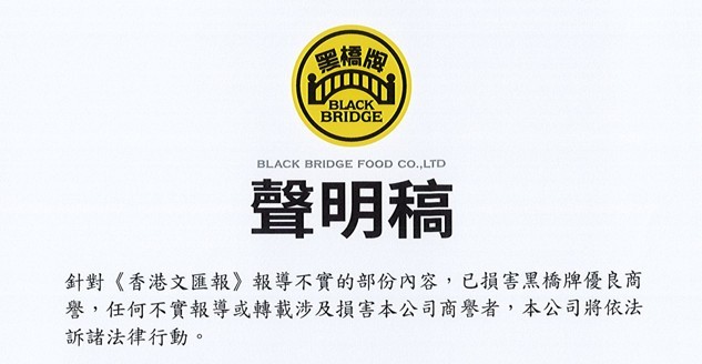 對於此報導內容,黑橋牌嚴正聲明:「本公司全部採用CAS及合格屠宰廠的台灣豬肉原料,絕不含瘦肉精。定期自主檢驗豬肉原料,均檢驗合格,敬請消費者安心食用。」黑橋牌更嚴肅表示,針對《香港文匯報》報導不實的部份內容,已損害黑橋牌優良商譽,故對於任何不實報導或轉載涉及損害本公司商譽者,將委託律師依法訴諸法律行動。