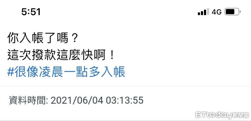 ▲2020年曾領取者,撥款首日6月4日一大清早就直接現金入帳,台南市民眾直呼撥款效率快,「足感心」。(圖/記者林悅翻攝)