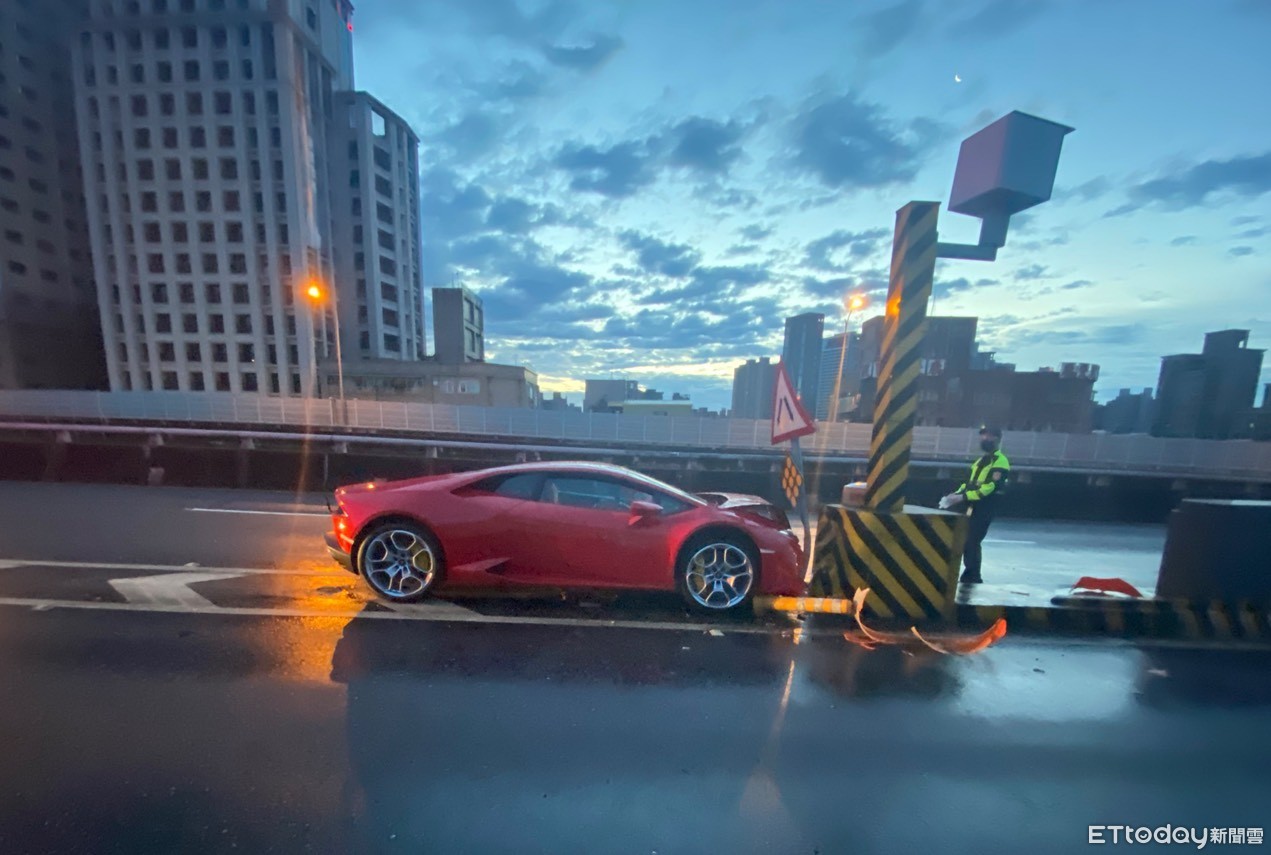新北市一輛要價1508萬元起跳的紅色藍寶堅尼小牛(Huracan Coupe V10)超跑今(7日)清晨4時許行經台64快速道路時,於板橋民生路匝道口自撞分隔島,車頭當場爛毀內凹成V字型,車內安全氣囊也爆開;警消獲報到場後,一度遍尋不著駕駛人,直到約10分鐘後,一名身材姣好、雙腿修長的徐姓女子才跑回現場,自稱是駕駛人,確切事故因還有待警方釐清。