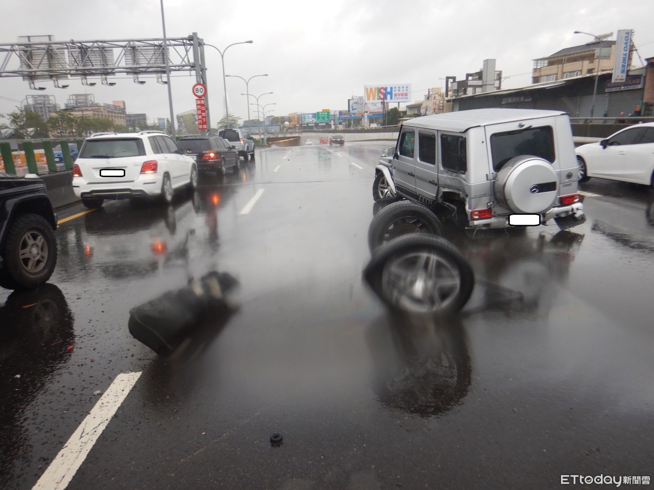▲賓士越野車水漂失控自撞,後傳動軸與2輪胎脫離車體。(圖/民眾提供,下同)