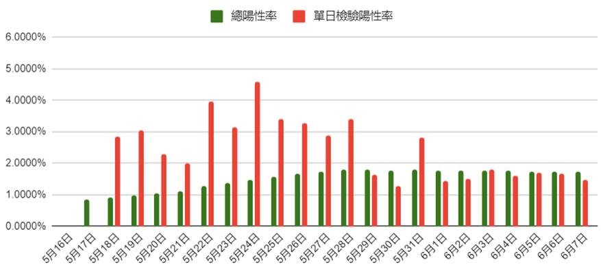 台大化學系助理教授徐丞志隨後也在臉書分享總陽性率與單日檢驗陽性率趨勢圖,指出今日確診數看起來比前幾天少了一半,「但這並不是疫情反轉,而是因為昨天只驗了14000 例」,僅為上週平均值的一半,因此若以單日檢驗陽性率看來,情勢跟一個禮拜前相比「是沒有什麼差別的」,他相信這也是三級延長的主要原因。