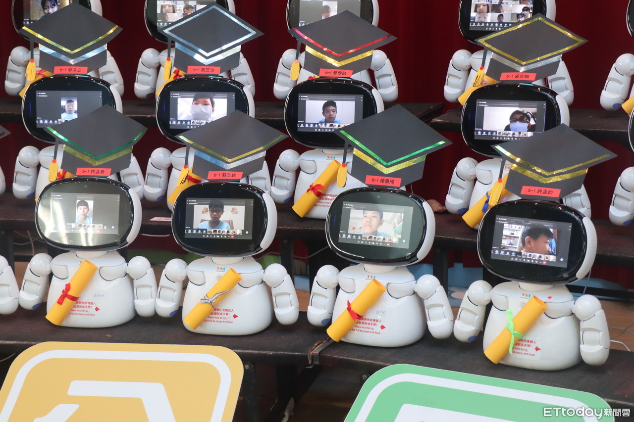 還有老師致詞時情緒湧上來,對著機器人邊哭邊講祝福感言,手上還拿著衛生紙,說著:「恭喜寶貝畢業了,態度一天天轉變,從懵懂小孩變成貼心孩子,態度決定一切,祝福各位畢業快樂。」畫面溫馨感人。