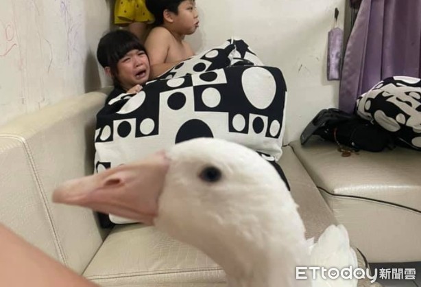 照片中可見,2隻大白鵝被放出來後一臉茫然,呆呆地在沙發東張西望,後面卻有3個嚇到躲在角落的小孩,其中一個妹妹滿臉驚恐地大哭,甚至拿來棉被阻擋,拒絕大白鵝靠近,原PO看到這一幕忍不住笑場,「我家小孩只有家鵝能鎮壓,媽媽吼到心很累。」