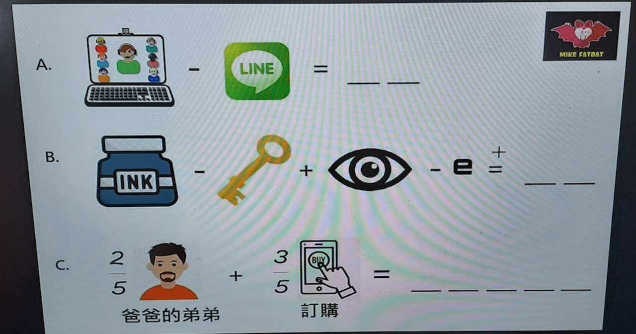 不過,還是有不少人解出答案,分別是「online-line=on」、「ink-key+eye-e=in」、「2/5 uncle+3/5 order=un+der=under」,也有網友認為,這就只是英文版腦力激盪,「把單字寫出來其實蠻簡單的,很有創意」、「腦力激盪吧,只是變成英文而已」。