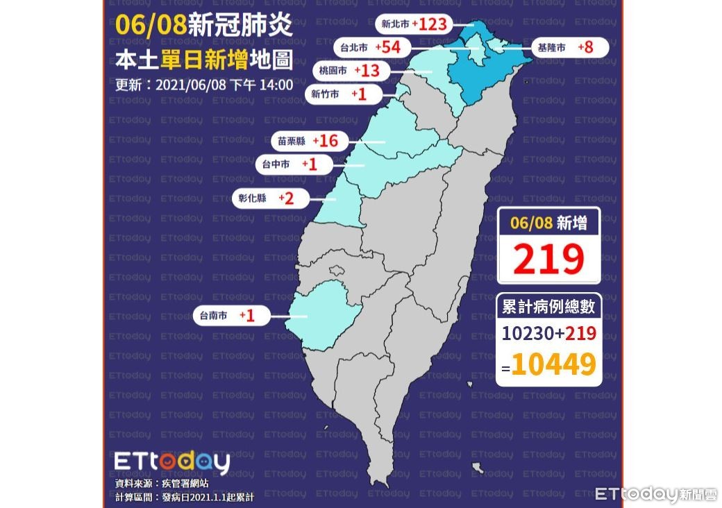中央流行疫情指揮中心(8)日公布國內新增219例本土病例,確診個案中新增22例死亡,其中,新北市新增了123例,累計總數飆破5千例,但今日仍有13縣市皆是+0,不過指揮官陳時中表示,目前疫情尚未趨緩,毫無放鬆本錢。《ETtoday新聞雲》製作了「2021年新冠肺炎全台本土病例分佈圖」,讓大家一目了然。