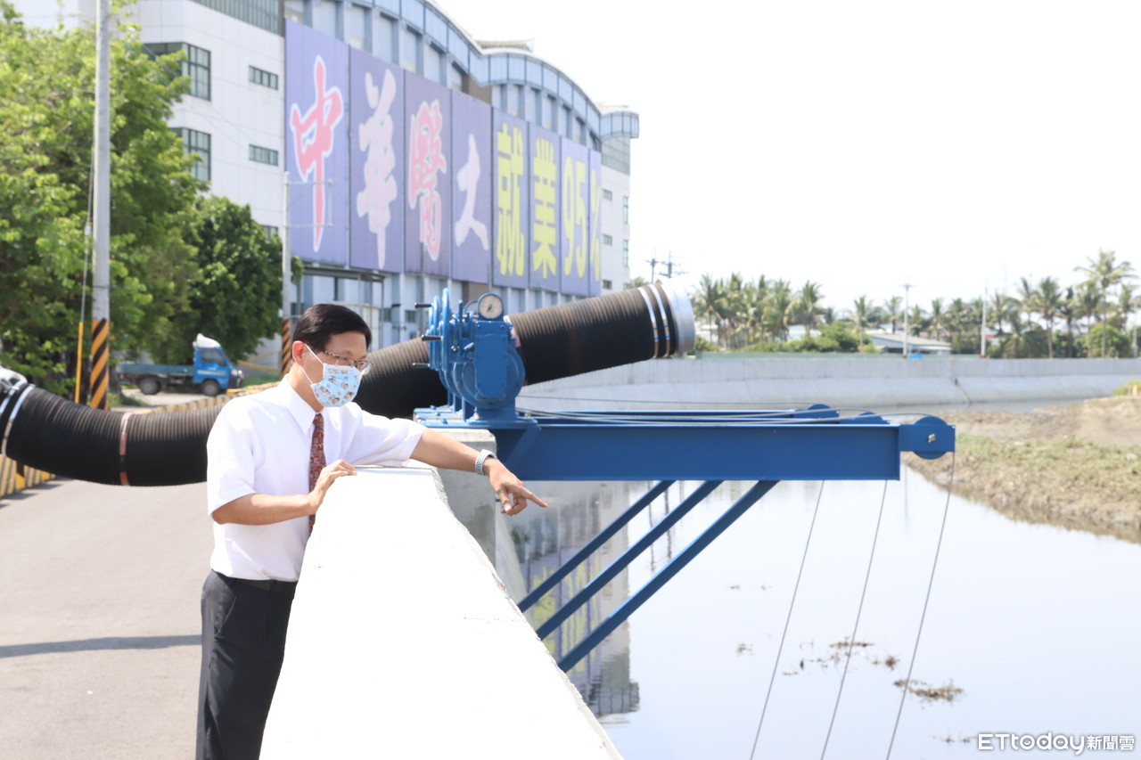 ▲近期的梅雨鋒面為台南地區帶來超過421公厘的雨量,中華醫大曾信超校長視察完工的堤岸工程和校園抽水站,感謝第六河川局和台南市政府攜手整治三爺溪、加高堤岸。(圖/記者林悅翻攝,下同)