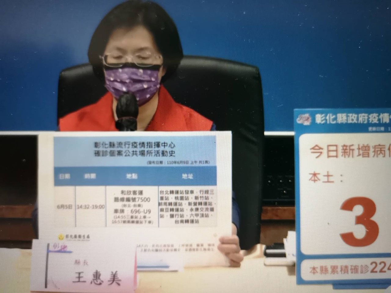 中央流行疫情指揮中心今(9日)宣布,今新增本土案例274例,其中彰化縣新增3例,縣長王惠美下午召開防疫記者會,表示今天確診的3例個案中,1例為牌咖傳染鏈,另外2人感染源仍待查;值得關注的是,其中一名確診者5日當天下午曾從台北搭乘和欣客運前往台中朝馬,再接駁返回彰化,王惠美提醒有相關接觸史的民眾須提高警覺,自主管理14天。