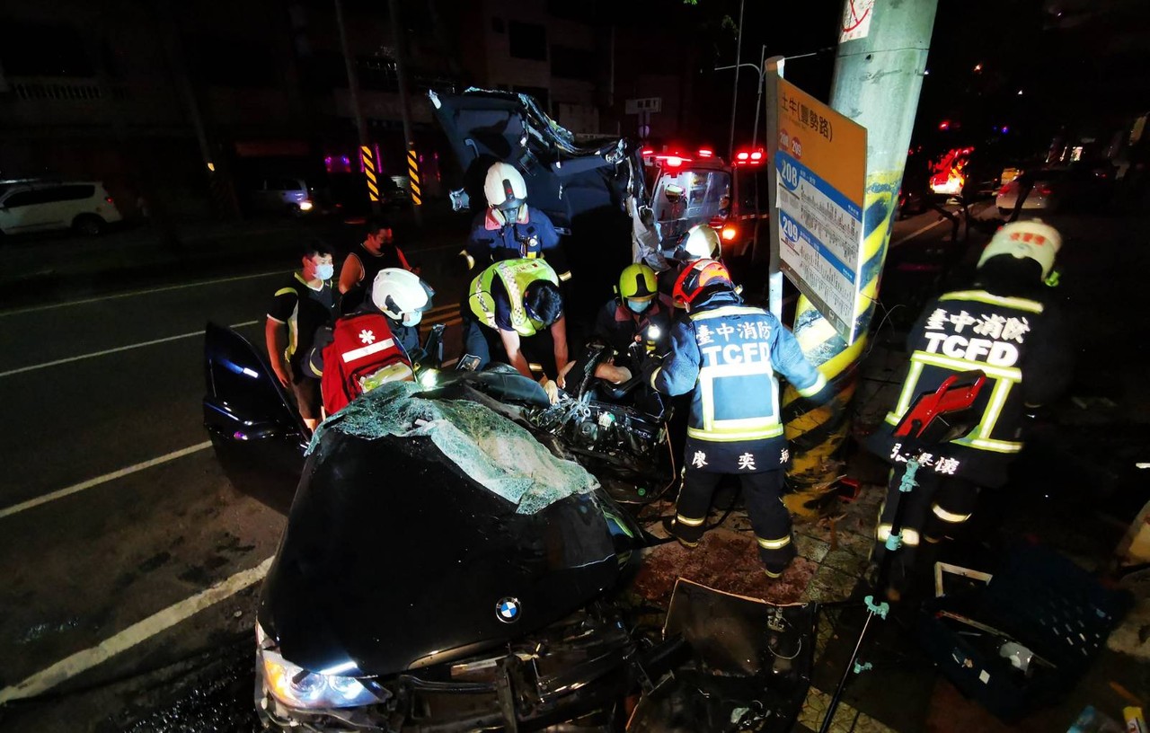 台中市10日深夜發生死亡車禍,一位男子開著BMW前往潭子途中,疑似車速過快失控撞上路邊公車站牌與電桿,車上2名乘客輕傷,但駕駛因車體嚴重變形卡在車上,消防人員獲報後到現場,花了2小時把駕駛拉出。不過在這段期間,駕駛因受傷意識逐漸模糊,送醫後傷重不治。