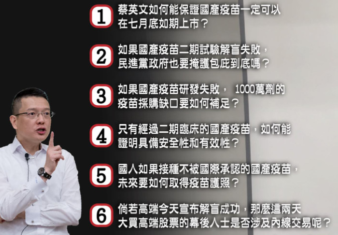 四、只有經過二期臨床試驗的國產疫苗,如何能證明具備安全性和有效性?五、國人如果接種不被國際承認的國產疫苗,未來要如何取得疫苗護照?六、倘若高端今天宣布解盲成功,那麼這兩天大買高端股票的幕後人士是否涉及內線交易呢?