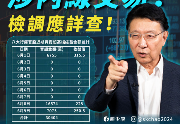 高端研發的新冠疫苗10日下午5時公布解盲結果。對此,中廣董事長趙少康質疑,高端連2天開盤跳空漲停,顯人有人有內線消息先得知解盲情形,才敢大膽下大單。