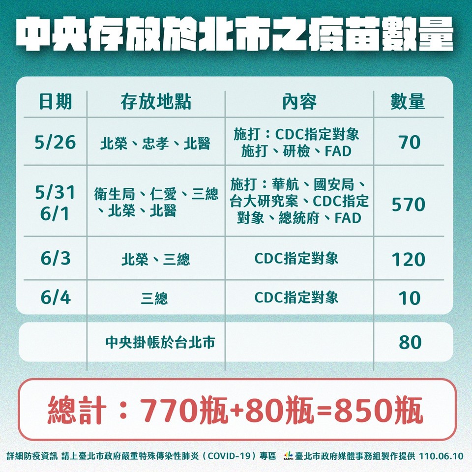 關於柯文哲9日表示,中央有寄放疫苗在北市,柯文哲10日補充,大家臨時統計都不是很精確,經過整晚算一次,中央說有650瓶寄放在北市醫院,這帳掛在我們這裡,事後更精確的比對,5月26日存放在北榮、忠孝、北醫,為CDC指定對象施打、研檢、FAD,數量為70瓶;5月31日和6月1日存放在北市衛生局、仁愛、三總、北榮、北醫,為華航、國安局、台大研究案、CDC指定對象、總統府和FAD施打,共570瓶;6月3日存放於北榮、三總,為CDC指定對象施打,共120瓶;6月4日存放於三總,為CDC指定對象施打,共10瓶。
