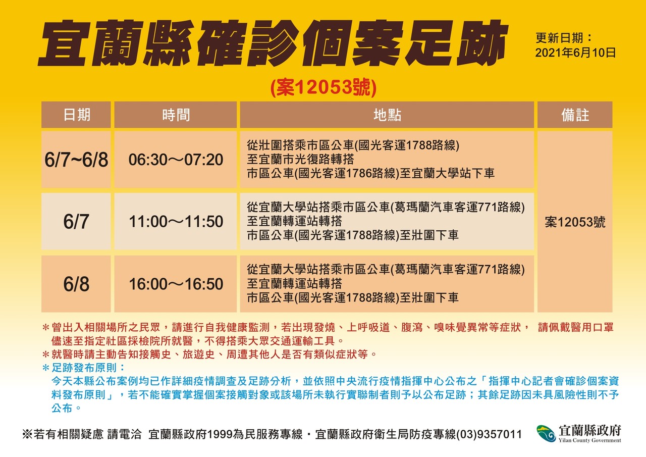 宜蘭新增1確診(案12053)足跡曝!6/7、6/8兩天搭市區公車來回壯圍、宜市、宜蘭大學站、宜蘭轉運站等地;宜蘭至10日共累計87染疫。