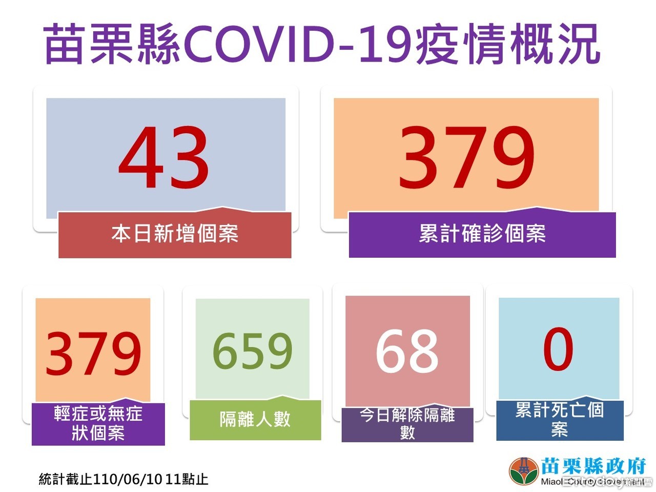 中央疫情指揮中心10日公布國內新增263例本土病例,其中43例在苗栗。苗栗縣長徐耀昌下午召開疫情記者會說明,苗栗累積確診個案已達379例,均為輕症或無症狀個案,隔離人數達659人,另有68人於10日解除隔離,同時公布苗栗縣確診個案分布圖。