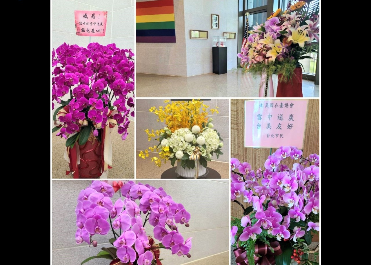 ▲AIT被狂送花籃,感動回應:永遠記得。(圖/翻攝自Facebook/美國在台協會 AIT)