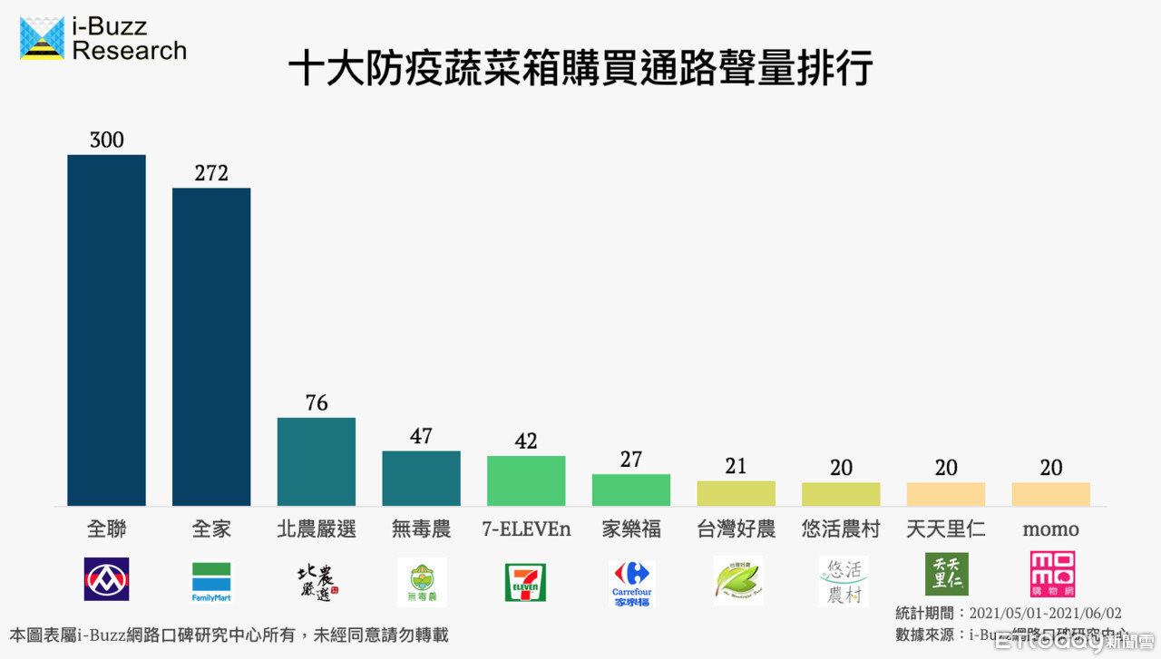 根據i-Buzz網路口碑研究中心「十大防疫蔬菜箱購買通路聲量排行」顯示,前3名分別是全聯、全家和北農;值得注意的是,雖然全聯蔬菜箱最夯,但北農嚴選則因為CP值高,呼聲最高。
