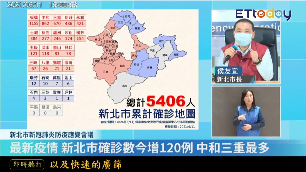 侯友宜在防疫記者會上公布各區最新累計數據,包括:板橋1155例,中和862例,三重670例,新莊486例,永和421例,土城384例,新店277例。