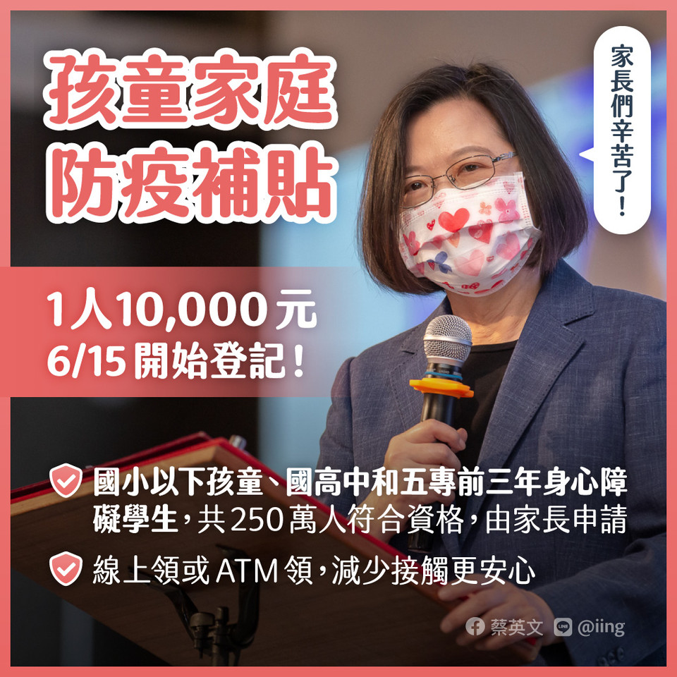 蔡英文說,政府注意到家長的需求,在紓困4.0當中,特別增加了每位孩童10,000元的孩童家庭防疫補貼,將在下週二6月15日正式上路。只要家裡有國小以下小孩,或有國高中、五專前三年身心障礙學生,家長就可以申領,共250萬人符合資格。