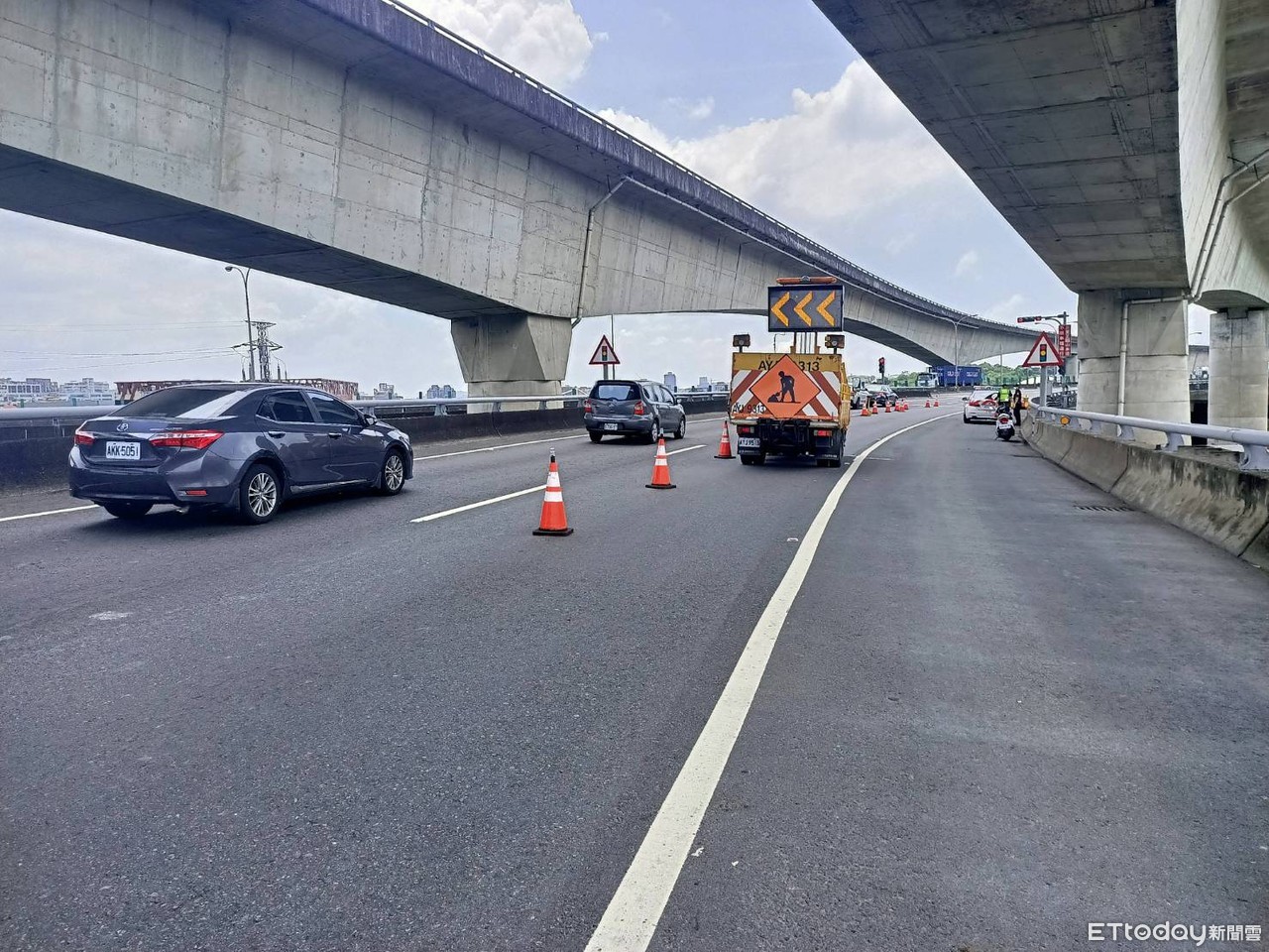 ▲北市交流道口塞爆,上了國道發現「車道也縮減了」。(圖/記者邱中岳翻攝)