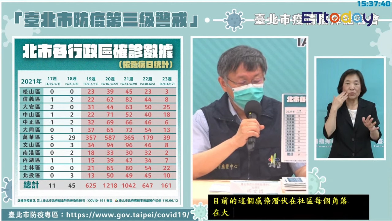 中央流行疫情指揮中心12日宣布新增250例本土病例,其中北市65例;另外有26人死亡,總死亡數達411例。台北市長柯文哲12日下午召開記者會,公布12行政區確診數分布,其中萬華區為1561人染疫為最多,其次是文山區281人;另外,6月6日至6月12日的累積確診數為161例,比上一周的647例,減少了486例。