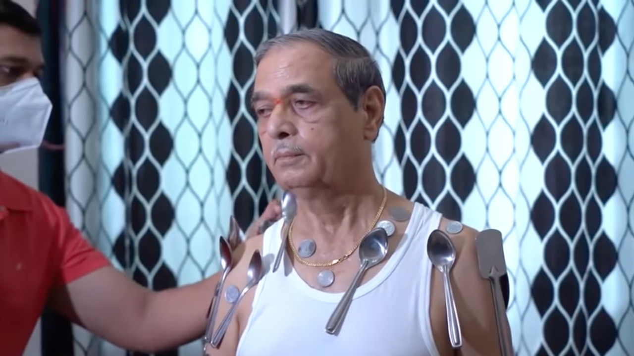 ▲印度老翁聲稱打完新冠疫苗之後,身體產生磁力。(圖/翻攝自YouTube/Khabardar24x7)