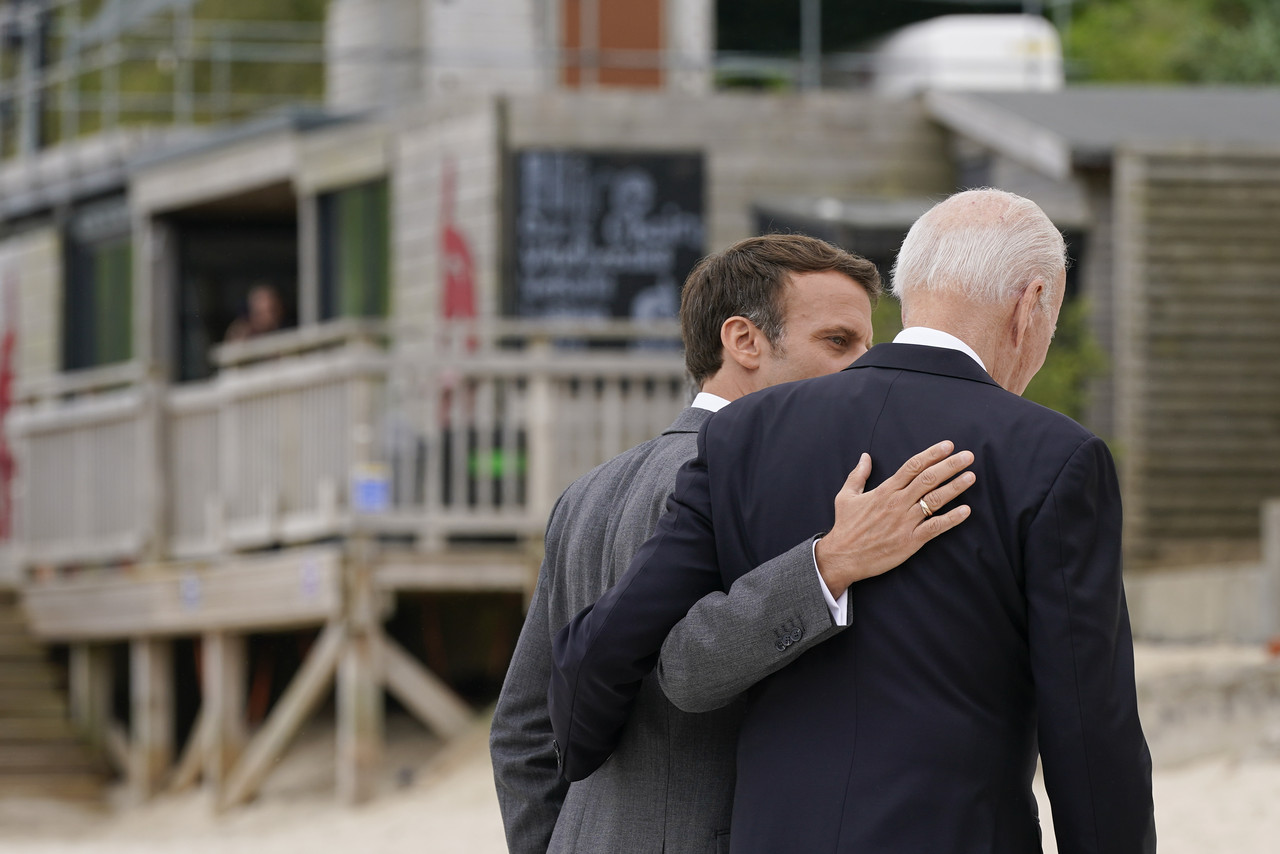 七大工業國(G7)高峰會11日正式於英國康瓦爾郡登場,除了峰會議題外,各國領袖間的互動也成為媒體關注的焦點。法國總統馬克宏(Emmanuel Macron)11日步入會議地點前,就突然伸手扶住美國總統拜登(Joe Biden)的背,兩人就這樣「打破社交距離」,以超近距離談話,儘管拜登的年紀都可以當馬克宏的父親了,但兩人的動作就宛如哥倆好一樣,引發熱議。