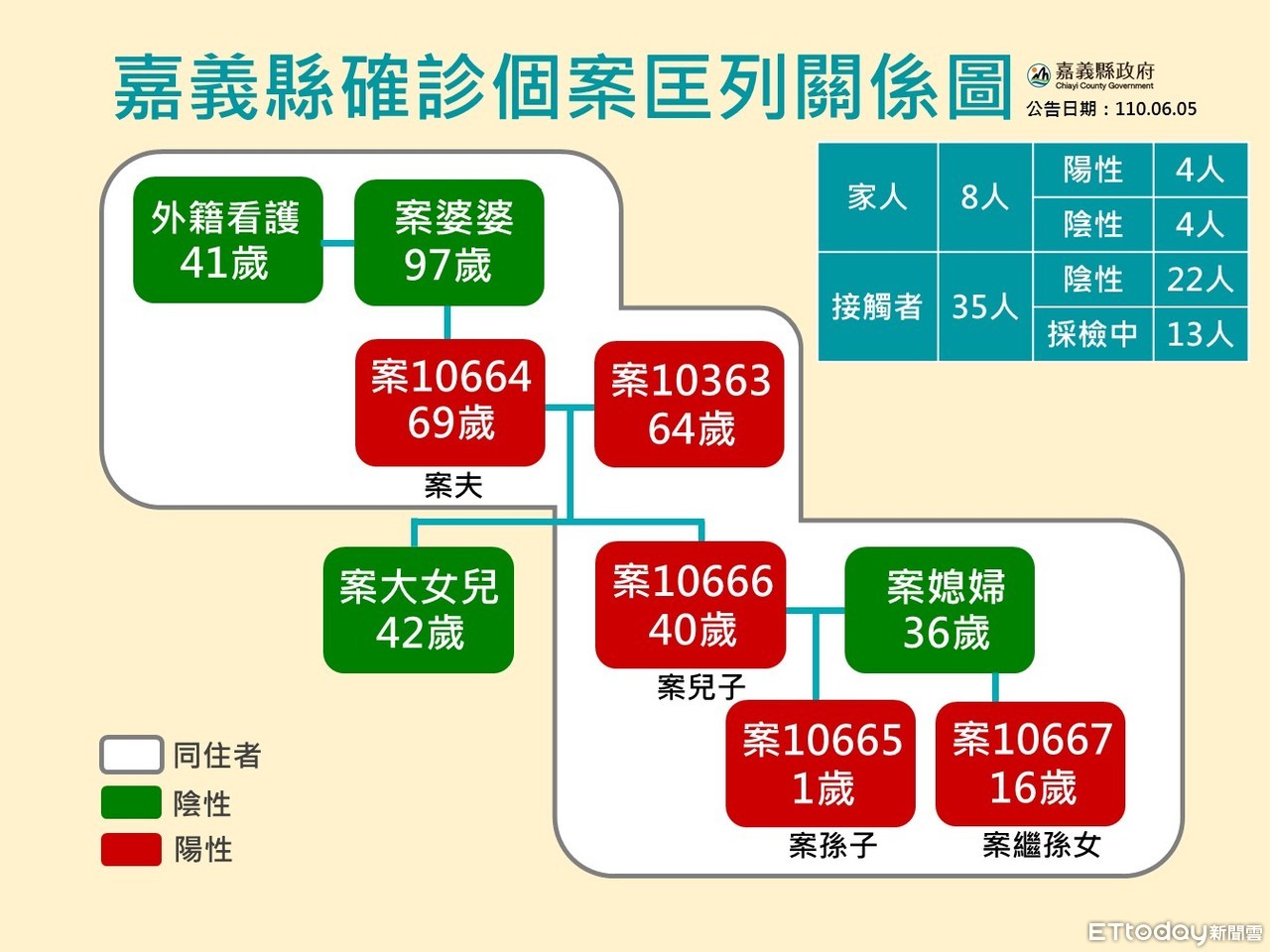 嘉義縣政府5日召開防疫記者會時說明,婦人(案10363)家庭群聚案再添3人確診,分別為婦人69歲丈夫(案10664)、40歲兒子(案10665)、1歲孫子(案10666),其中丈夫無明顯症狀,務農為生,平日經常在村內正興寺旁樹下涼亭活動,3日曾至村內活動中心巡迴醫療看診,其餘時間多停留於家中,因被匡列為接觸者,由衛生局通知採檢後確診住院治療。