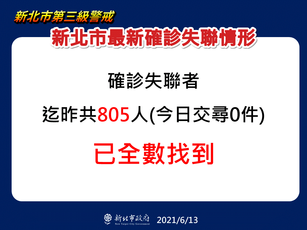中央流行疫情指揮中心13日公布國內新增174例本土病例,其中新北市有81例。新北市長侯友宜下午在記者會上,特別感謝警察同仁,並宣布截至昨天為止,805位確診失聯者已經全數找到;另外,新北街友安心計畫,已安置199人。