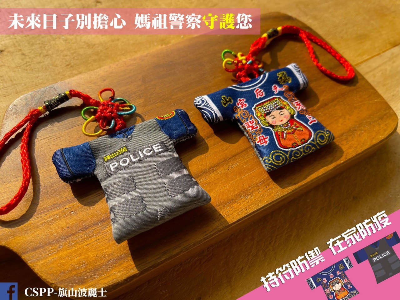 國內新冠肺炎疫情仍嚴峻!許多民眾想到地方上的廟宇參拜、求護身符保平安,但礙於目前各地宗教廟宇都有嚴格的防疫規定而作罷,高雄旗山分局和旗山天后宮在防疫期間跨界合作,推出聯名款媽祖護身符2.0,並在「CSPP-旗山波麗士」臉書粉絲專頁舉辦抽獎活動,讓民眾免出門就有機會獲得可愛的護身符。