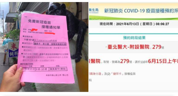 許立民也貼出台北市網路預約疫苗的網站頁面,同樣都有提醒民眾記得攜帶健保卡和身分證,但相較於高雄市說明詳細的時段,台北市網路預約系統僅顯示,幾月幾日上午或下午時段,未寫幾點到幾點,接種地點也僅寫醫院名稱,未寫出位置,以許立民貼出的範例來說,網站僅寫「您已在台北醫大附設醫院取號,號碼為279號,請於110年6月15日上午時段前往接種疫苗」。