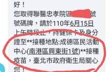 李明賢14日表示,有民眾幫忙家中85歲長輩上網預約施打新冠疫苗,預約成功也取得號碼牌,結果拿到北市衛生局通知簡訊一查,簡訊上面通知接種地點為「成德區民活動中心(南港區興東街一號)」,地址居然是錯誤的,要求北市府立即修正公告。