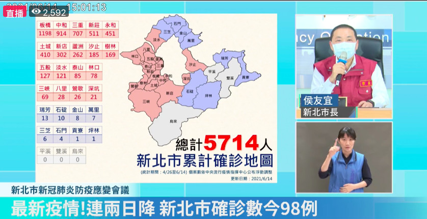 中央流行疫情指揮中心14日公布國內新增185例COVID-19確定病例,以新北98例最多,市長侯友宜召開防疫記者會,並公布各區最新累計數據,截至今天增加5714例,另外,今天有12區有確診個案,其中17區沒有確診個案,希望這些區能繼續保持,從周遭確診個案數少的地方,逐漸一個區、一個區做好防疫保衛戰。