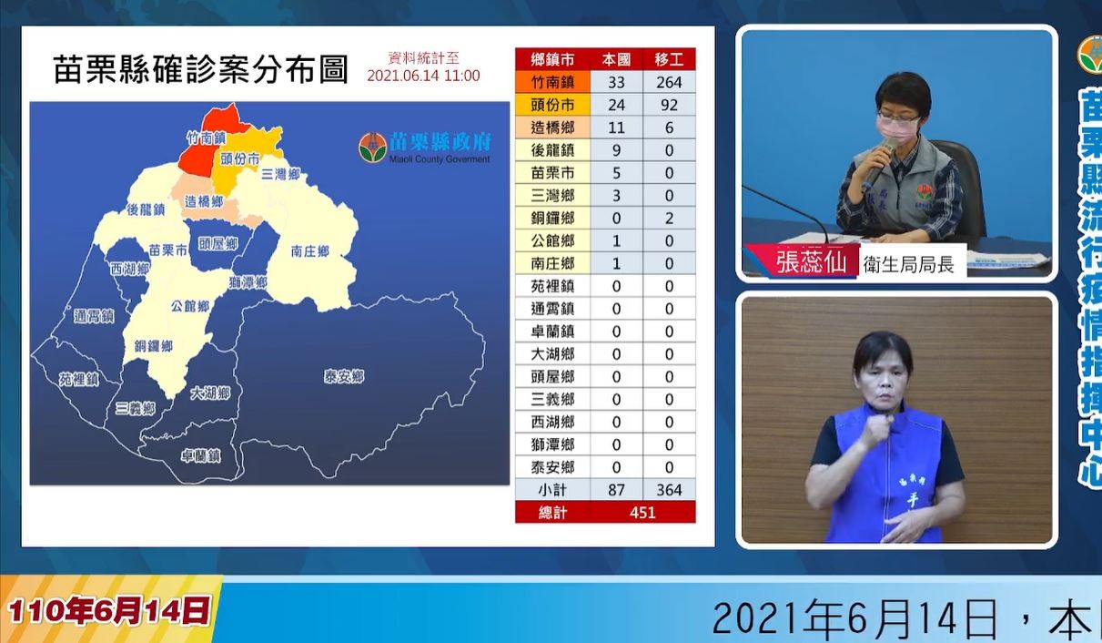 新冠肺炎疫情仍然嚴峻,指揮中心14日宣布新增185例本土病例,另有15人不幸喪生,苗栗則新增7名本土案例。另外,目前苗栗累計451人確診,其各鄉鎮市的確診分布圖也隨之曝光,以竹南鎮33名本國、264名移工為最高。