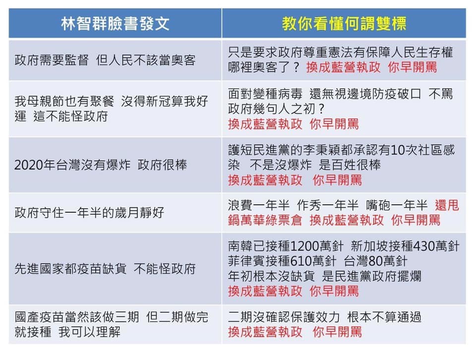 面對同事不同人時,以不同的標準看待,即被稱為「雙標」。有網友整理出律師林智群的臉書PO文,製作出「藍營執政,你早開罵」的6大雙標對照表嘲諷。對此,林智群也直接回擊,「如果是藍營執政,去年疫情一定爆炸,我去年就死了,墳上的草比人還高,怎麼開罵?」