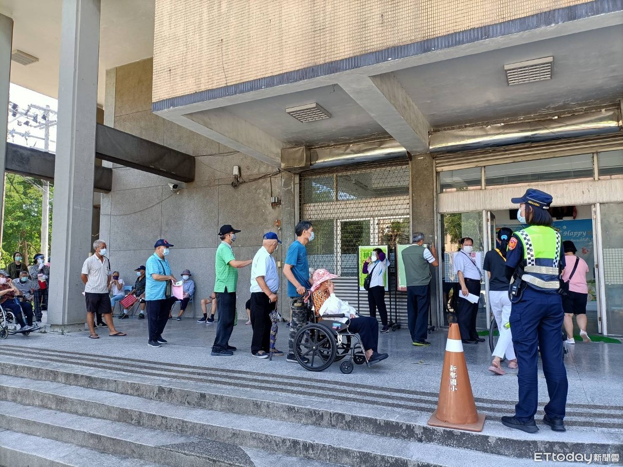 ▲桃園市平鎮市新勢國小首日88歲長者接種,長者在現場外排隊進入接種站。(圖/記者沈繼昌翻攝)