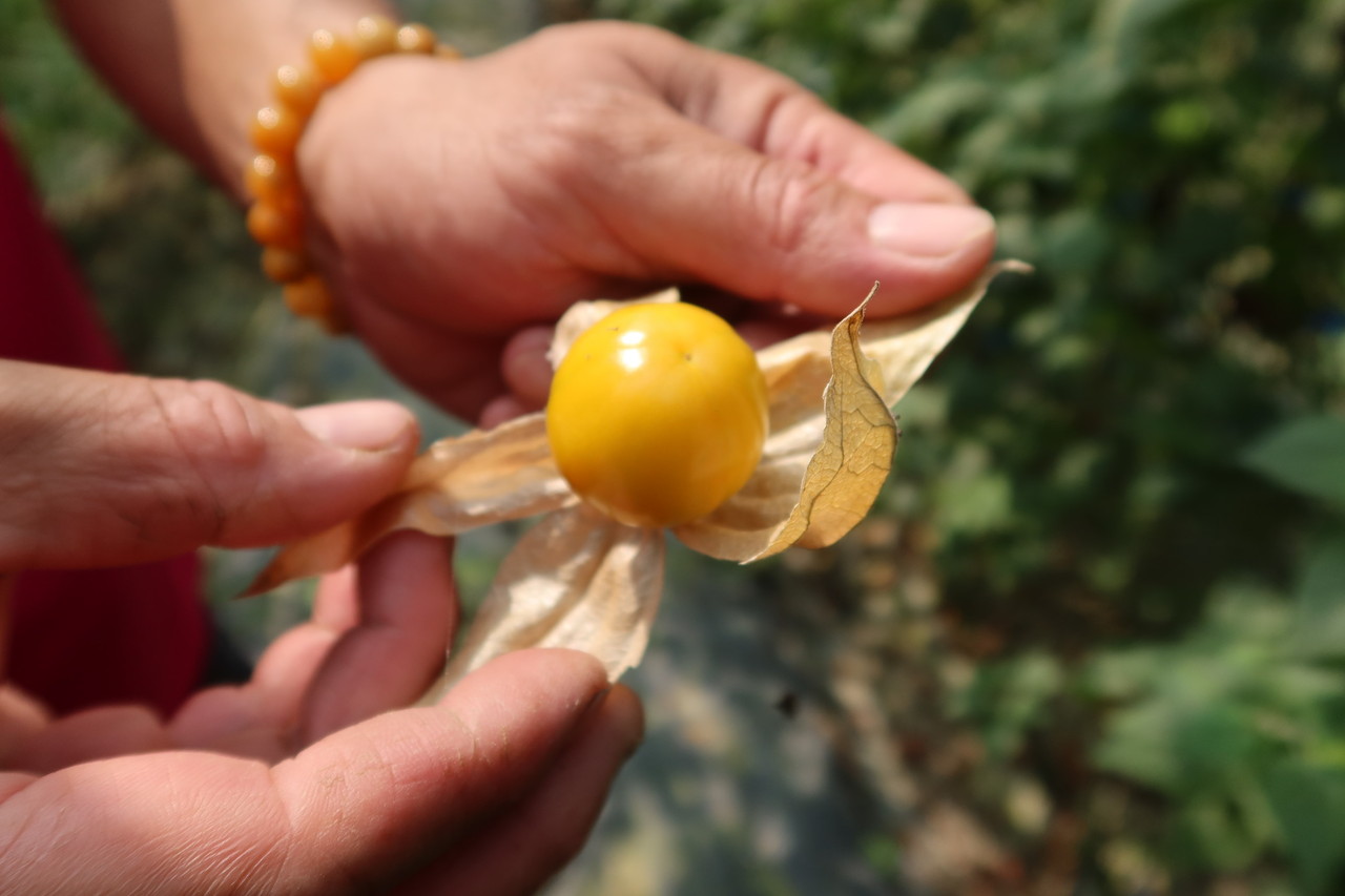 台南場場長楊宏瑛說明,酸漿為茄科酸漿屬草本植物,廣泛分布在溫帶和亞熱帶地區,果實包在花萼內,外型像個燈籠,因此俗名為「燈籠果」,其中祕魯酸漿果實金黃色,又稱為「黃金莓」,是目前消費市場主流,酸漿的用途與番茄相似,可以直接食用或者製成沙拉、甜點、果醬、果凍、調味品。