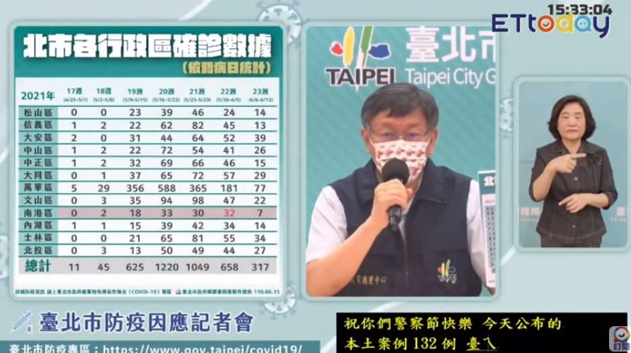 中央流行疫情指揮中心15日公布,新增132例本土確診,以新北市65例最多,其次為台北市26例,另新增8例死亡個案。台北市政府15日下午3時30分召開防疫記者會,由台北市長柯文哲、台北市副市長黃珊珊出席,《ETtoday新聞雲》全程直播。