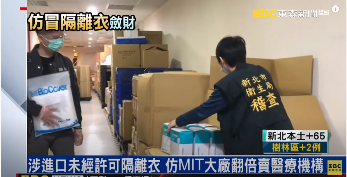 位在新北市五股工業區的眾里公司,涉嫌從大陸進口7.9萬件隔離衣,以及從越南進口10萬件隔離衣,總數將近18萬件,還發現從越南進口的根本沒有許可證,還偽造包裝成台灣大廠宇紘公司的貨品,對外以400件2萬元出售,跟正牌貨相比甚至翻倍牟利。