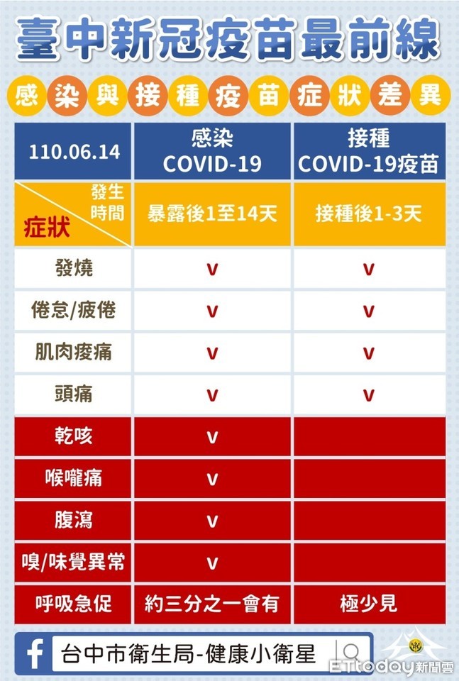 ▲台中市政府製圖讓民眾了解打疫苗副作用跟染疫症狀差別。(圖/市府提供)