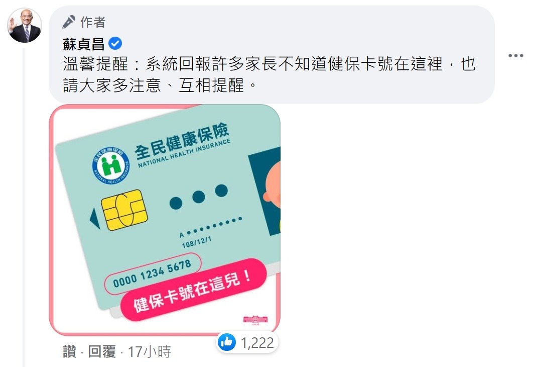 ▲蘇貞昌提醒健保卡號。(圖/翻攝蘇貞昌臉書)