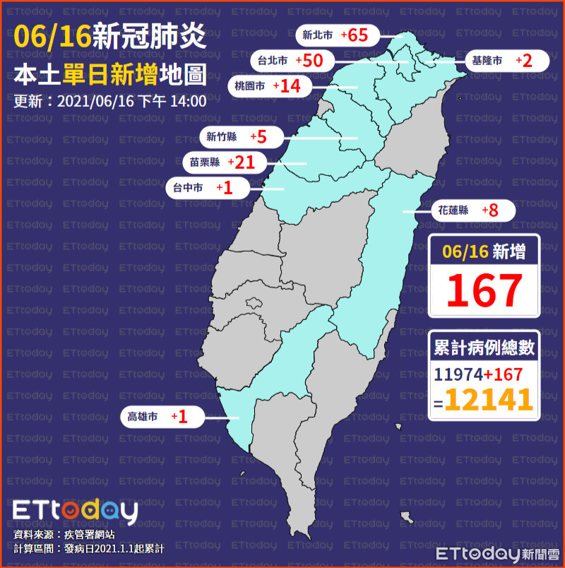 今日新增167例本土病例,個案分佈以新北市65例最多,其次為台北市50例,苗栗縣21例,桃園市14例,花蓮縣8例,新竹縣5例,基隆市2例,高雄市及台中市各1例。其中雙北地區以外縣市52例中,48例為已知感染源、4例關聯不明;相關疫情調查持續進行中。