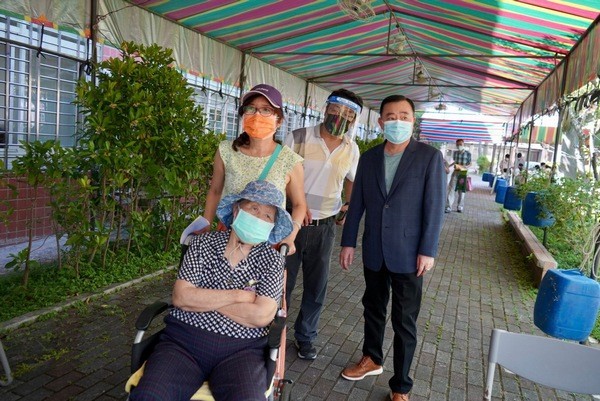 ▲桃園市議長邱奕勝(右)關心高齡長者施打疫苗。(圖/市議會提供)