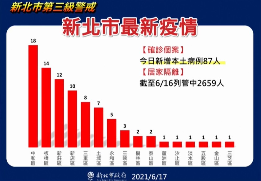 根據新北公布17日新增87例本土案例統計,今天確診數最多的是中和區18例,其次為土城8例、永和8例、三重8例、板橋14例、新莊12例、三峽3例、蘆洲1例、樹林2例、汐止1例、淡水1例、新店10例、五股1例、金山1例、泰山1例、三芝1例。