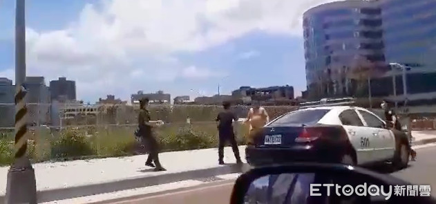 ▼壯碩全裸男在中和好市多賣場旁閒晃,4警員上前壓制 。(圖/陳以昇翻攝)
