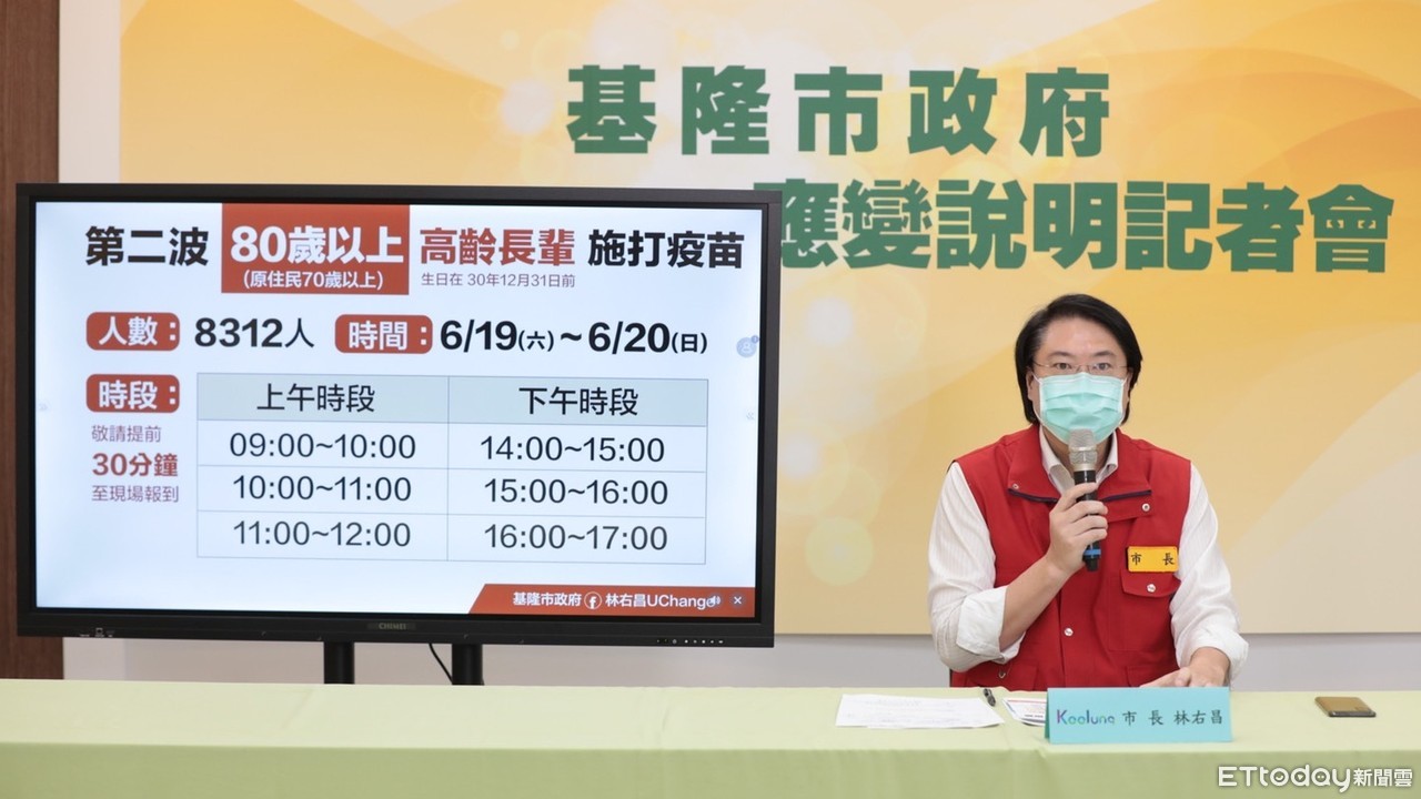 基隆市將於6月19、20日開放80歲(原住民70歲)以上長者施打新冠肺炎疫苗,市長林右昌今(17日)下午在記者會中表示,本市7區10站施打期程,統計本市符合資格的人數是8312人,提醒符合資格的長輩按照通知單上安排的時間,帶著通知單、健保卡跟簽好名的接種評估意願書,前往各施打地點接受疫苗注射。