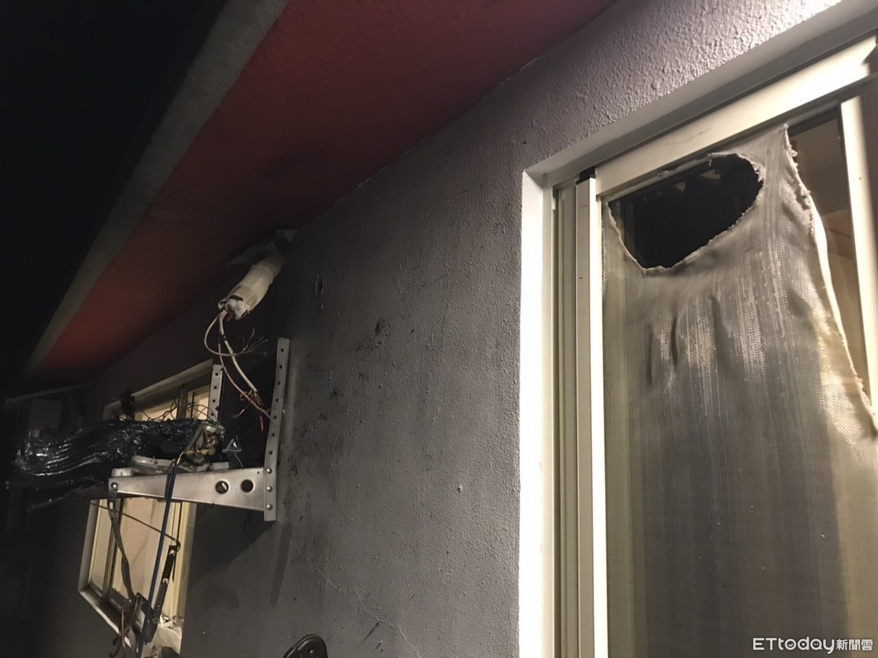 ▲維修工人在裝設冷氣時,不知原因發生爆炸,工人臉部流血不止,現場血跡斑斑怵目驚心。(圖/記者黃孟珍翻攝,下同)