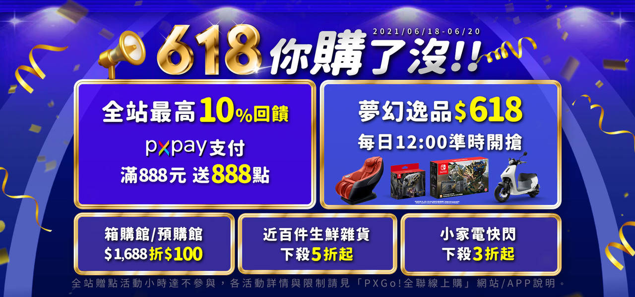 6/18至6/20全聯線上購「618你購了沒」期間,消費者更有機會以618元購入價值萬元以上的超火紅商品,最高價屬超過6萬元的Gogoro電動機車。活動採會員制,參加搶購活動須扣福利點,連續3天每日中午12點在線爆殺搶購,6/18限量6台的TAKASIMA高島愛舒服小沙發-享睡版(溫暖橘);6/19限量1台的Gogoro VIVA MIX KEYLESS 電動機車(合聲白);6/20限量8組的任天堂NS Switch 魔物獵人特仕版主機和PRO手把同捆組,通通只要618元,獨家活動僅在「PXGo!全聯線上購」「618你購了沒」。