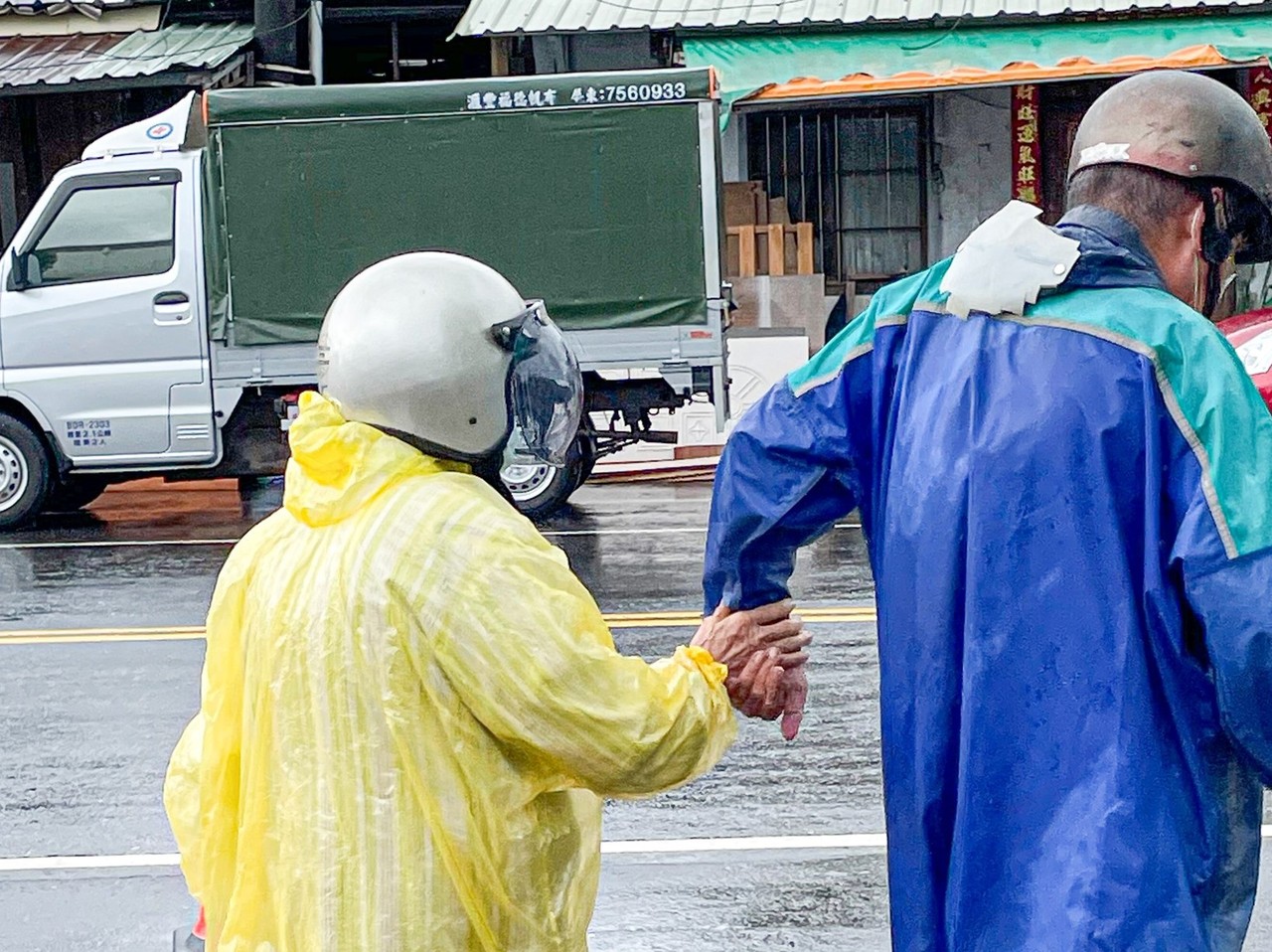 照片中,穿著藍色雨衣的阿公緊緊牽著後方的阿嬤,小心翼翼地走過因為下雨而溼掉的柏油路。潘孟安17日在臉書PO文分享這張照片並表示,這是在疫苗速打站外不經意看見的一幕,「看到這兩雙牽牢牢的手,耳邊響起二姐江蕙的《甲你攬牢牢》。」