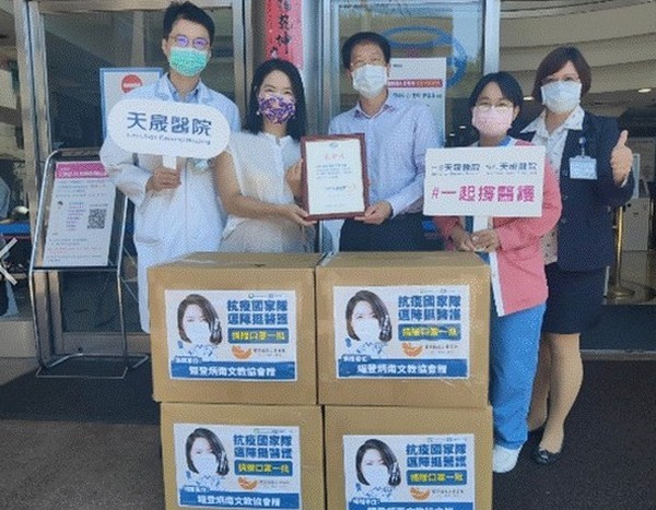 又為了感謝第一線醫護人員於疫期持續守護民眾健康,張碩芳也捐贈8000個防疫口罩給中壢天晟醫院,由醫療部高時貽副院長代表受贈。由於0-6歲是身障寶貝們的早療黃金時期,早療單位桃園寶貝潛能發展中心於疫期雖停課但未停學,因此,「勇敢媽咪」張碩芳特地捐贈2000個成人防疫口罩及2000個幼童防疫口罩給予教保員及身障寶貝們,期望大家都能夠受到更好的防護挺過疫情。