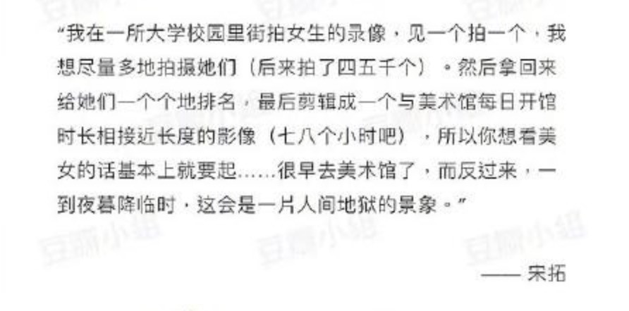不少大陸網民痛罵主辦方,這種出格作品怎麼還能展出,完全不尊重女性。檢視宋拓作品簡介,他強調把影片剪輯跟美術館開館時常一樣,並且提醒想看美女的人要一早去美術館,如果太晚去會看到人間地獄景象。